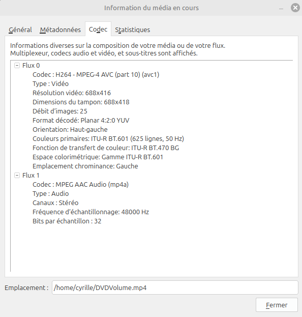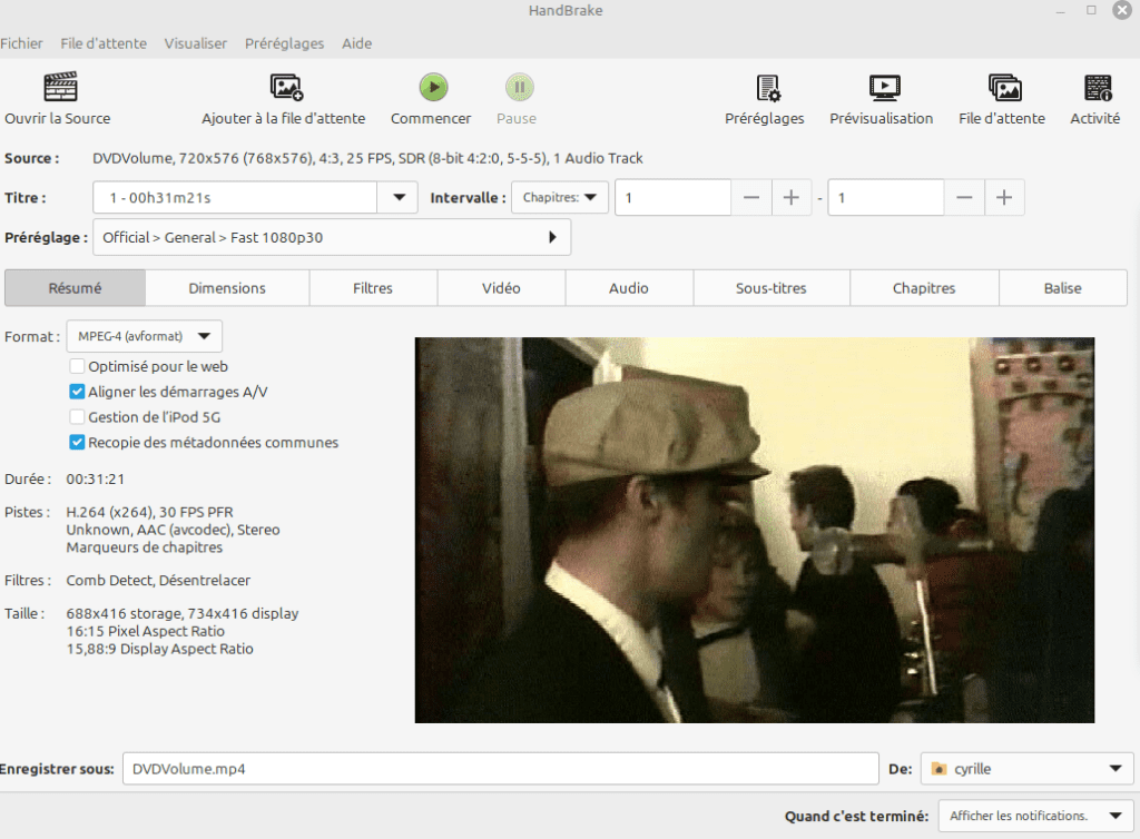 On remarquera que le logiciel est loin d’être idiot. Par défaut le profil sélectionné, ils sont nombreux et proposent la destination comme YouTube ou une Xbox, est sur du 1080p avec 30 images par seconde. Pourtant la résolution maximale du DVD n’excède pas le 720×480 et le DVD ici est en 25 images par seconde. On pourrait imaginer une déformation à la sortie, ce n’est pas le cas. Comme on peut le vérifier avec VLC, handbrake adapte pour un résultat satisfaisant.
