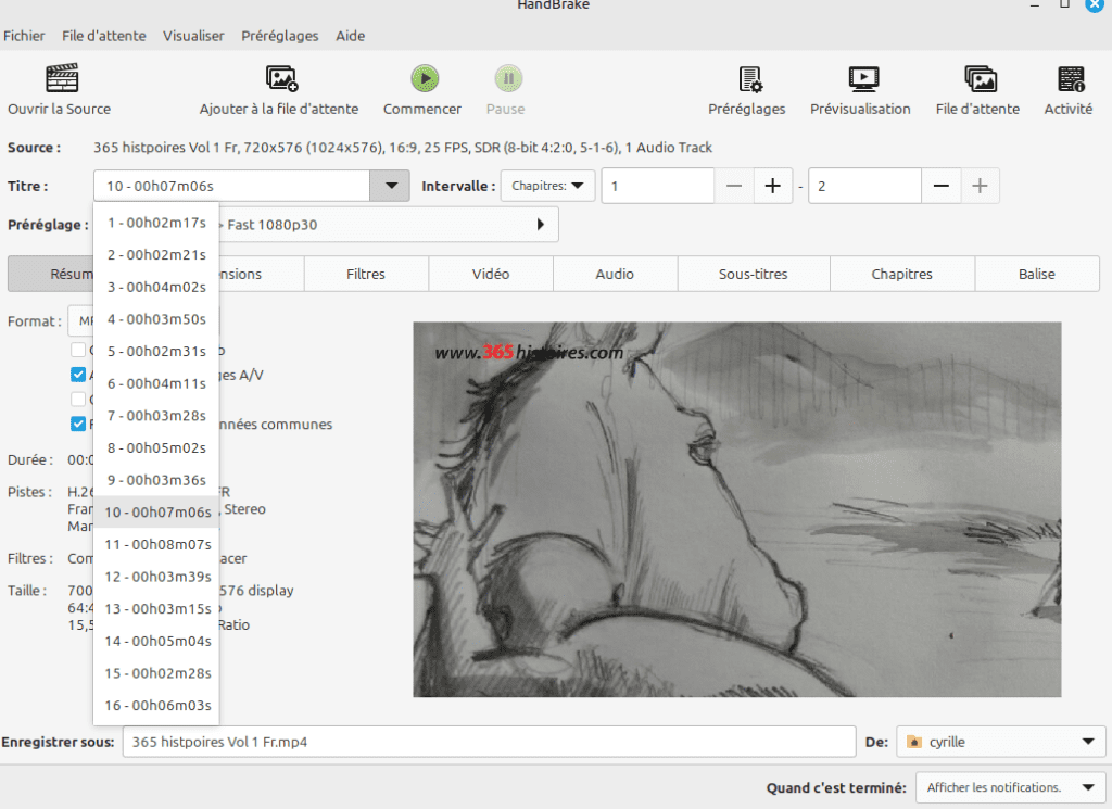 Comme on peut le voir, le nombre d’épisodes est très conséquent et Handbrake est allé chercher le titre le plus long