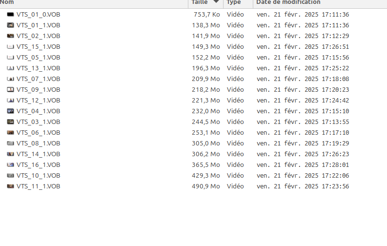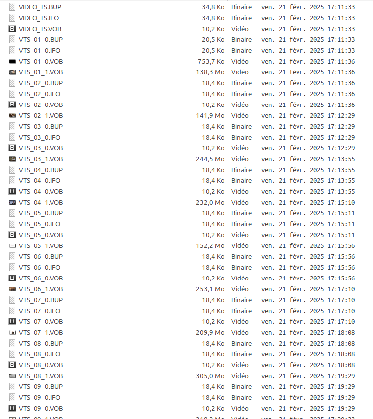 On notera que la copie se fait dans le répertoire dans lequel vous avez lancé la commande. On obtient à la sortie la liste de fichiers suivante dans laquelle on ne va conserver que les fichiers VOB de tailles « conséquentes ».