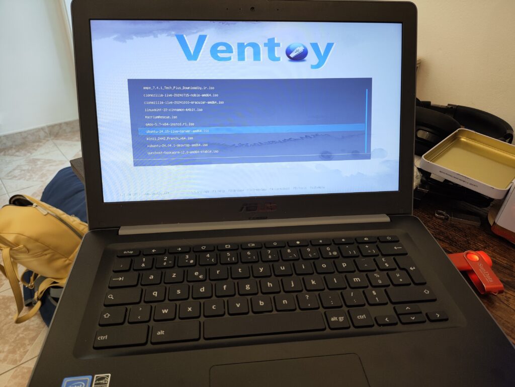 Comme on peut le voir dans l’écran ci-dessus, on voit Ventoy ce qui veut dire que le bios a été capable de lancer un système d’exploitation différent de ChromeOS.
